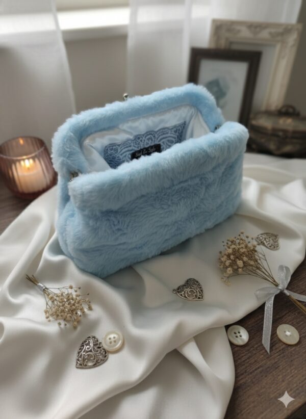 Χειροποίητη τσάντα, μοναδικό κομμάτι, μπλε χρώμα γούνας και διαστάσεις 31×17