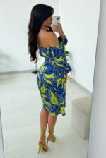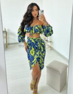 Σετ έξωμου τοπ με λάστιχα και δετής φούστας από σατινέ αέρινο ύφασμα.