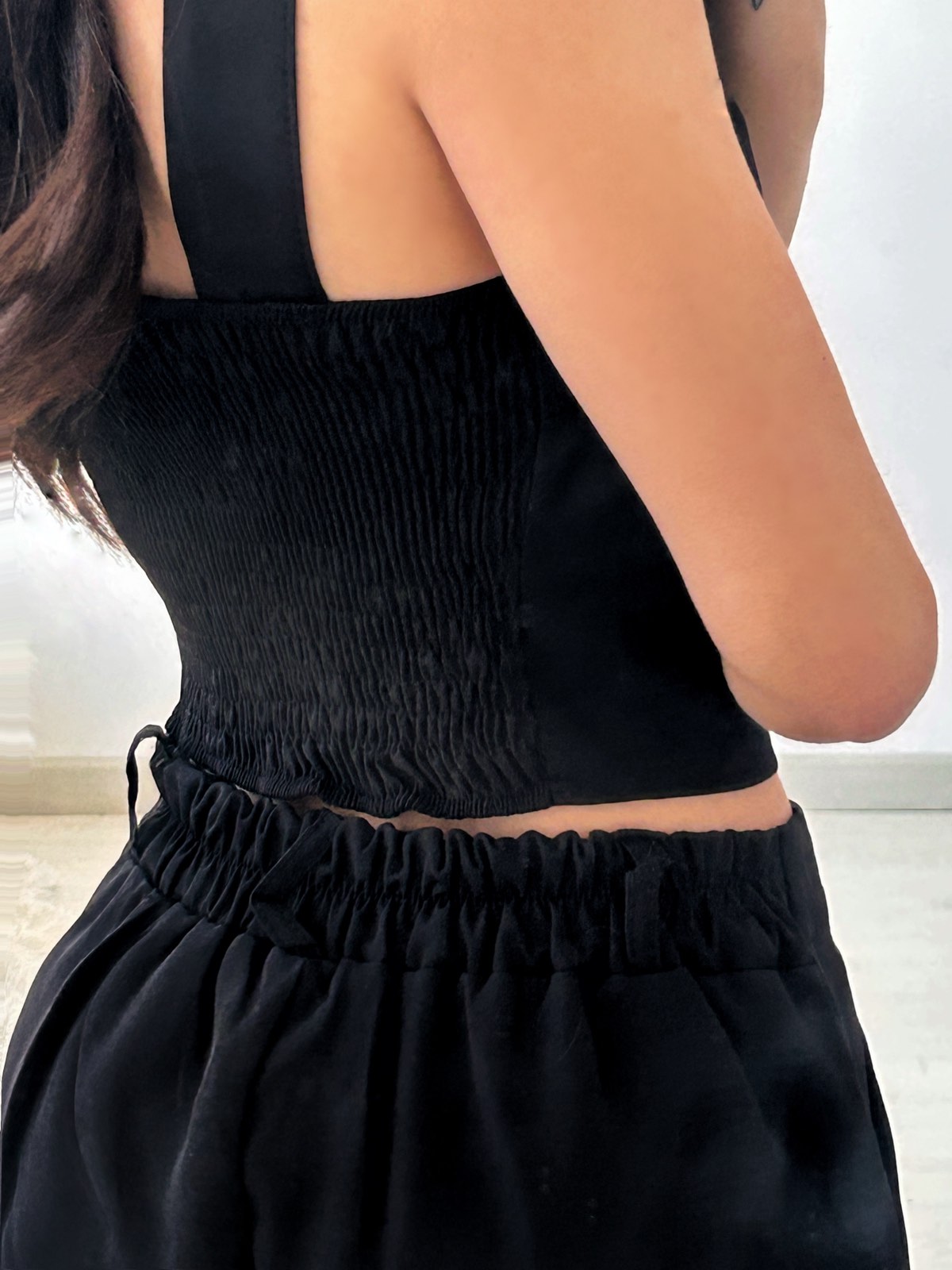 Σετ έξωμου τοπ με λάστιχα και δετής φούστας από σατινέ αέρινο ύφασμα.
